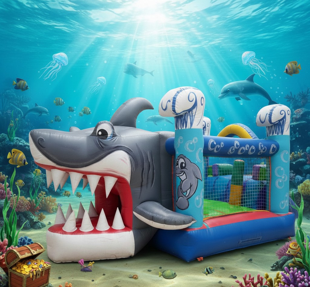 O Kid Play Tubarão é a atração ideal para transformar qualquer evento em uma verdadeira expedição submarina! Com um enorme tubarão inflável como destaque, o brinquedo reúne obstáculos, espaço para explorar e muita diversão em um cenário que desperta a imaginação das crianças.